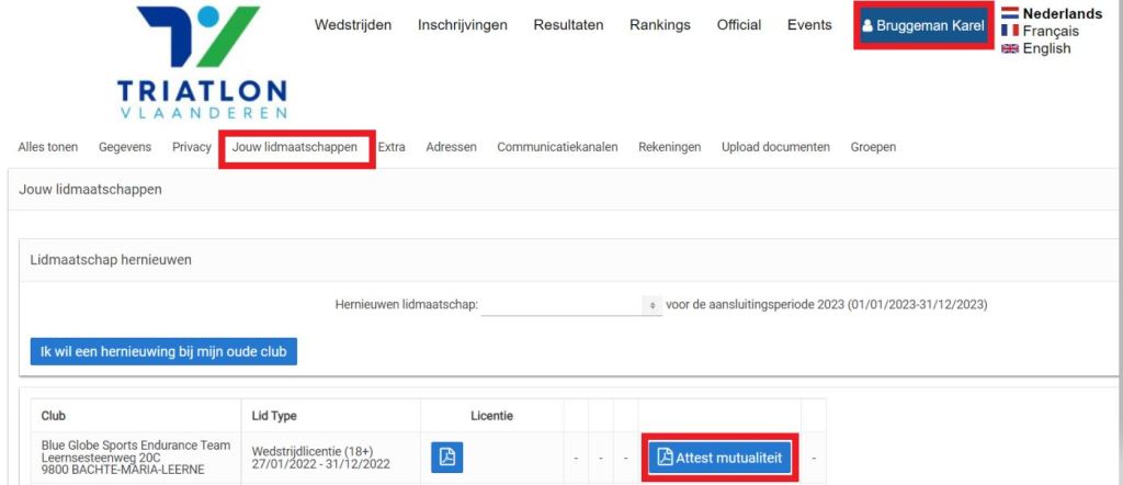 Het attest voor de mutualiteit kan je downloaden van de site van triatlon Vlaanderen. Inloggen met uw account.